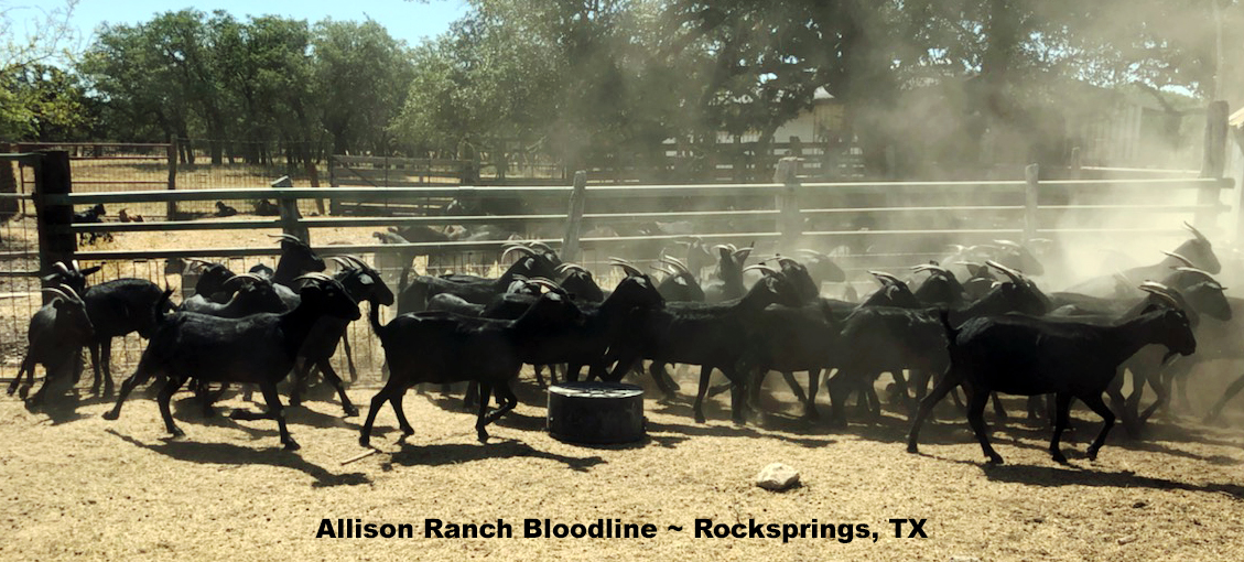 The Herd is selected for black coloring due to the advantages of fewer cases of pink eye and less fly issues. The selection process for our herd is the ability to travel long distances to water and forage, medium to large frames, good legs, no excess hair, rounded horns widely spaced, good utter size for twins but not overly large that may result in injury or the inability of kids to nurse. Allison Ranch Black Spanish Goats have now been raised by four generations of our family and we are appreciative of all those who have visited our ranch and purchased seed stock trhough the years.