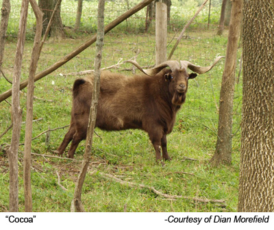 The Morefields have been pleased that in their recollection, they've never had a 'bad' mom in their herd. Nor have they had a goat that they couldn't handle easily. They enjoy the good temperaments of their goats, and the continued hardiness and cashmere production. They do not breed for meat, and prefer a brown coat to black.