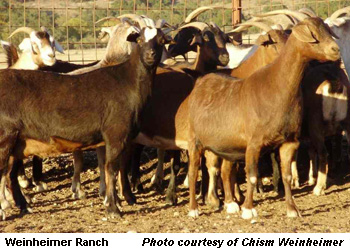 The Weinheimer Ranch was founded in 1878. Roy Weinheimer, like many Texans of his time, raised Angora goats for mohair, and kept his Spanish goats for feeding the family. He brought Spanish goats onto the family-run Weinheimer Ranch in the 1950's, and was a very progressive Spanish goat breeder for that timehe started selectively breeding them right away. Weinheimer would add a billy here and there if he found a better one.